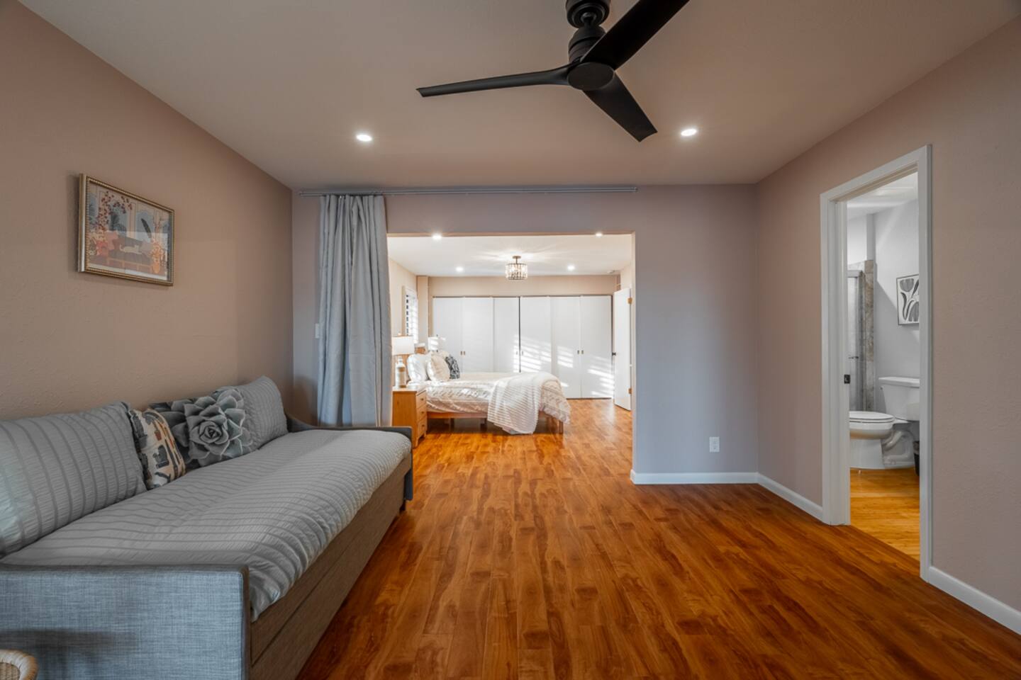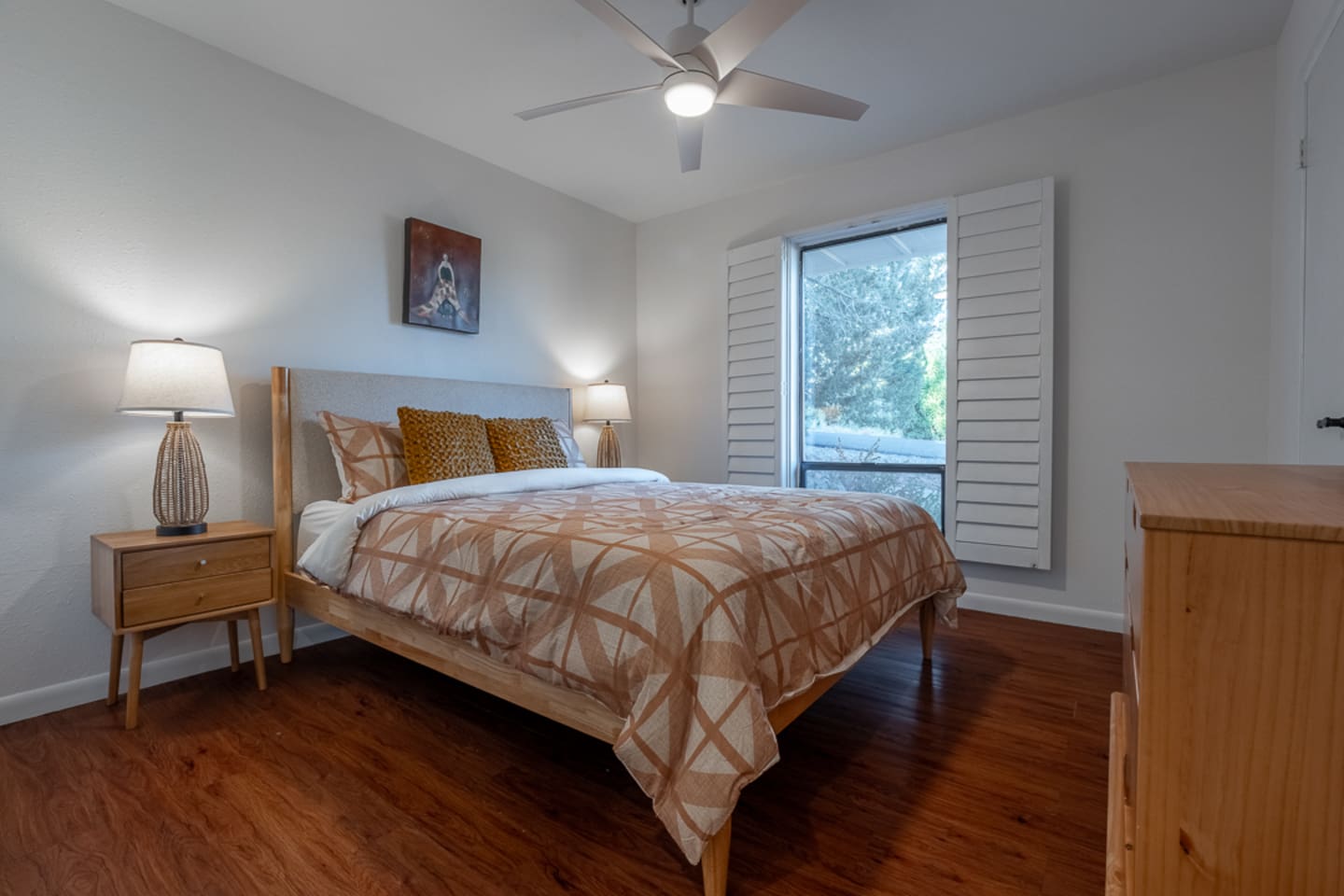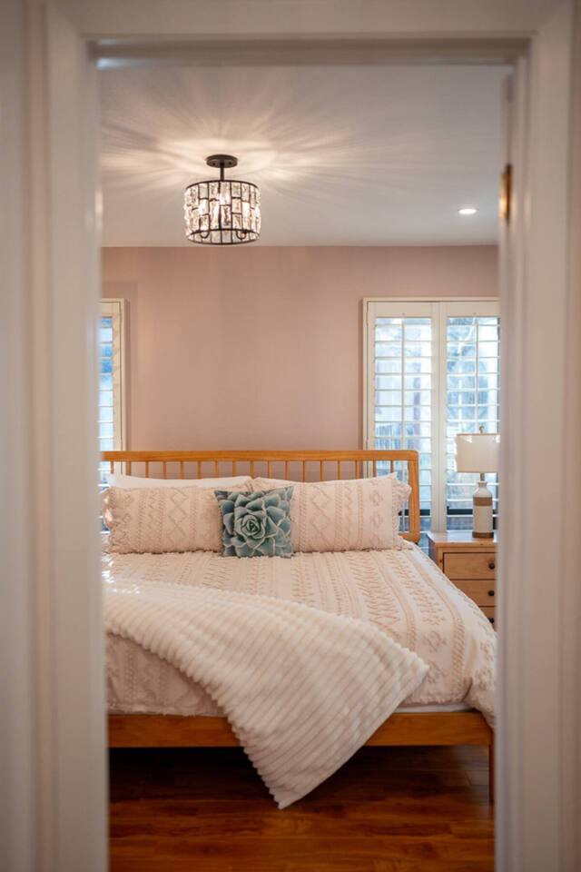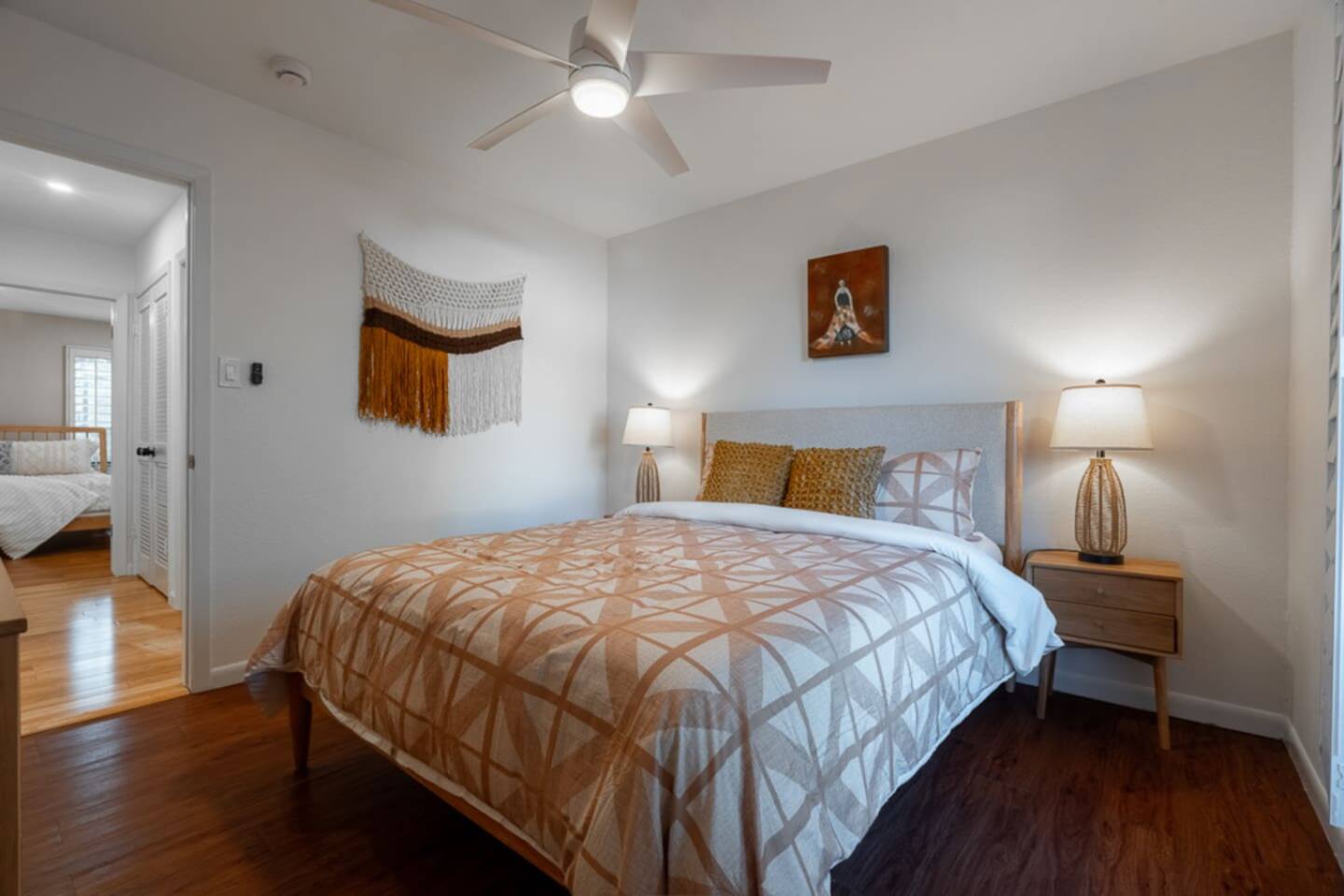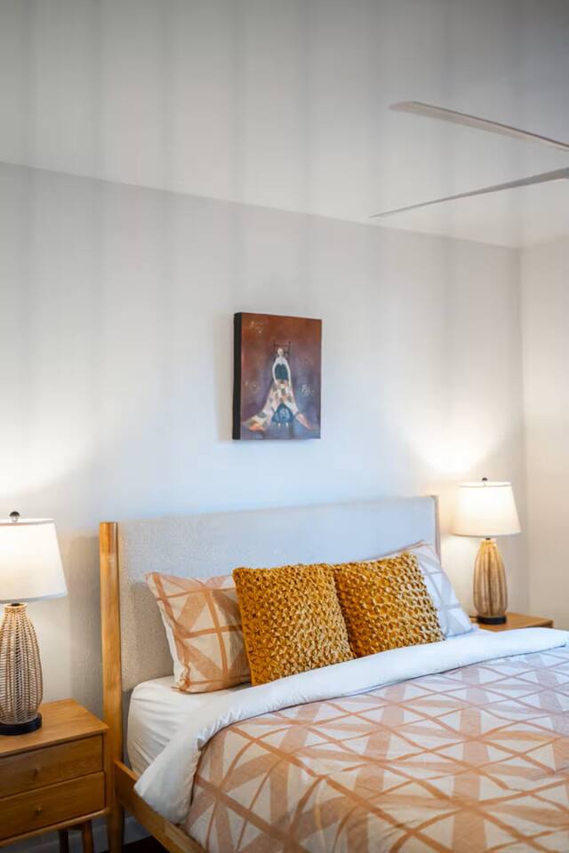 This spacious 2-bedroom, 2.5-bath home comfortably accommodates up to 6 guests. The primary suite features a king-size bed and an en-suite bath with a walk-in shower. There is an additional private space connected to the primary suite with a pull-out couch. The second bedroom includes a queen bed and access to a full bath. A half bath is available off the main living area. The open-concept kitchen, dining, and living spaces are perfect for gathering, and the large fenced backyard provides a peaceful spot to relax.