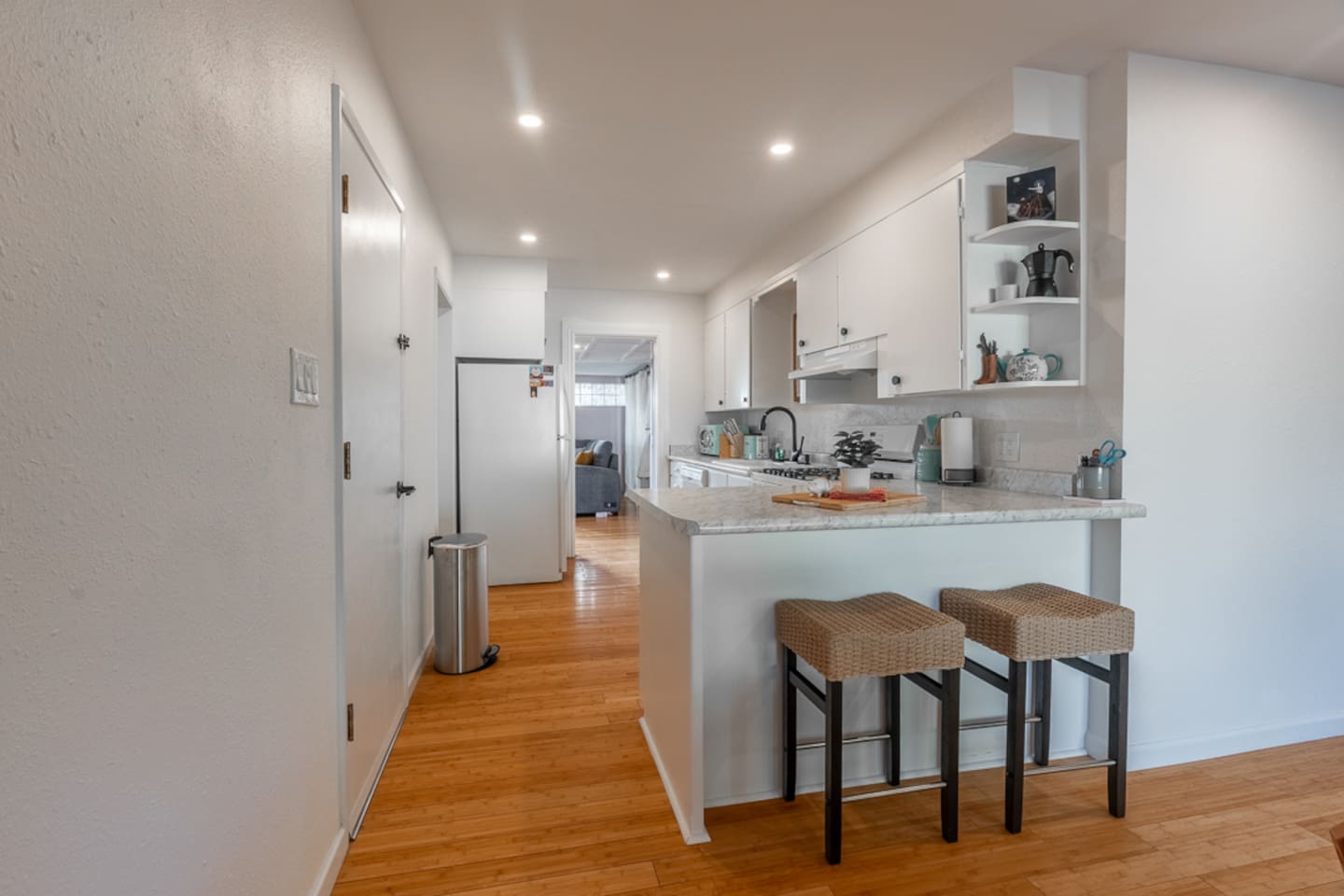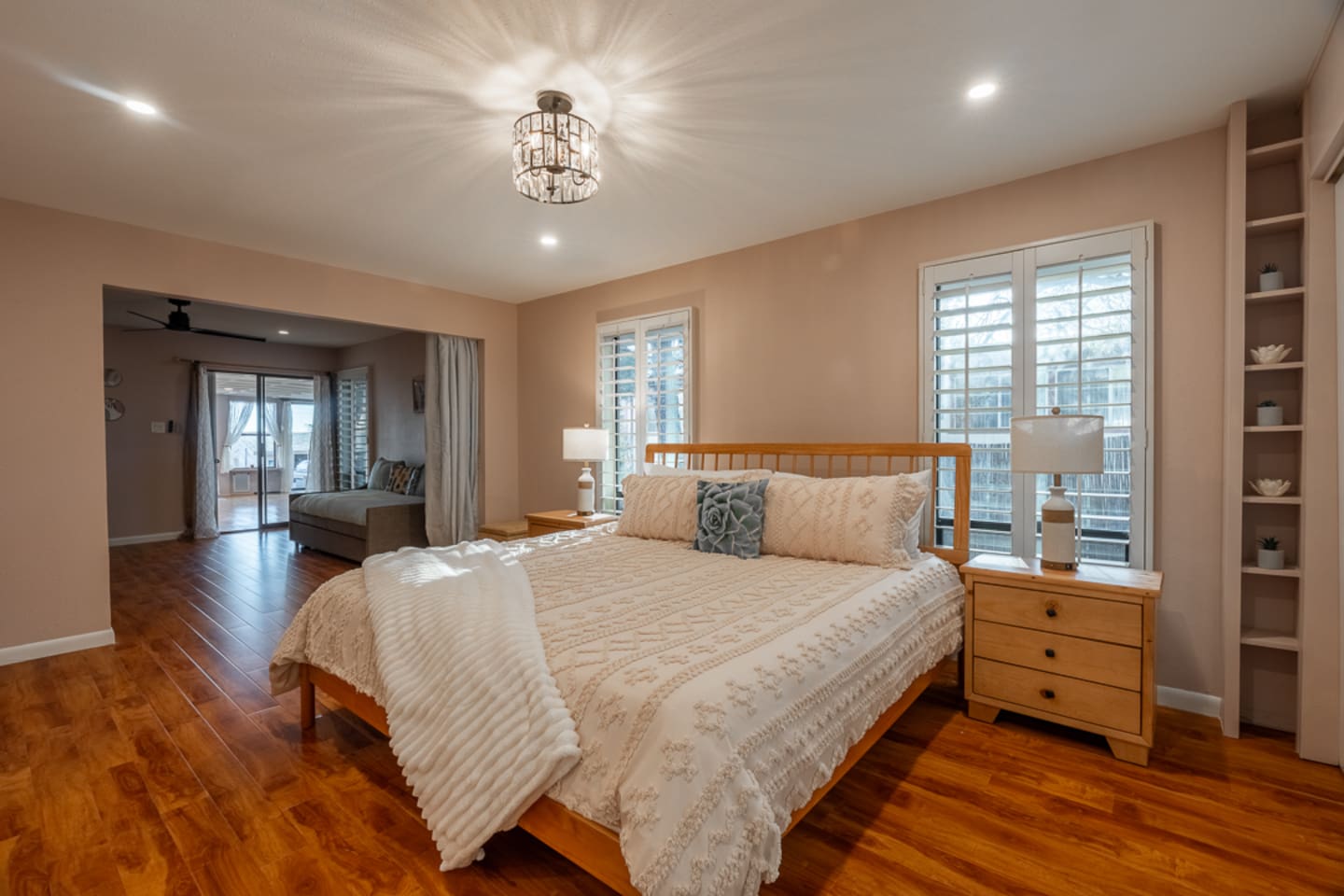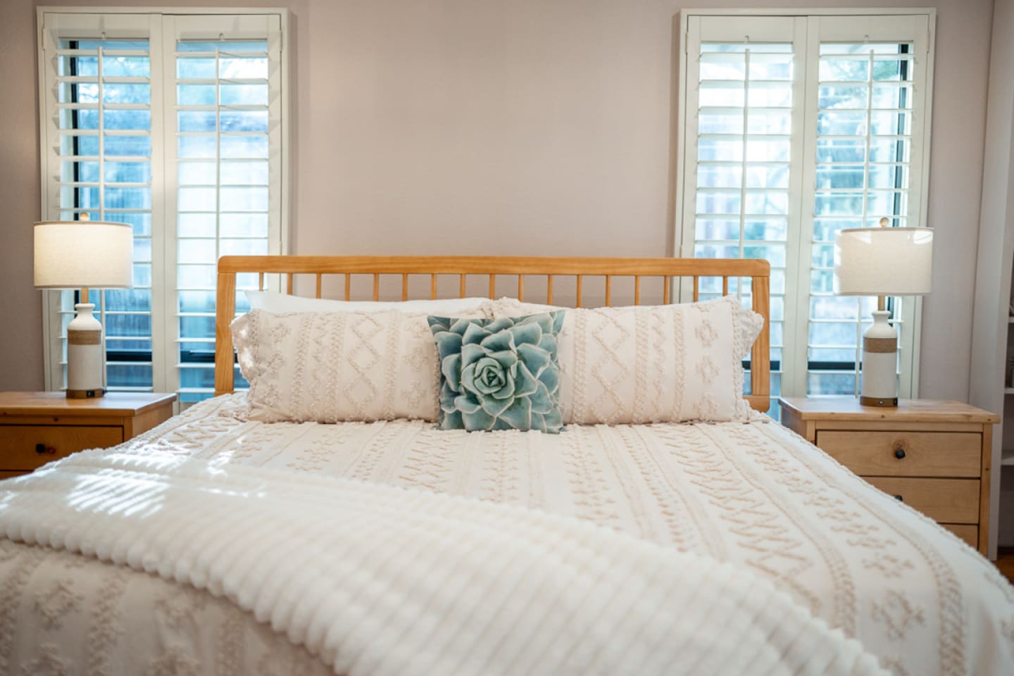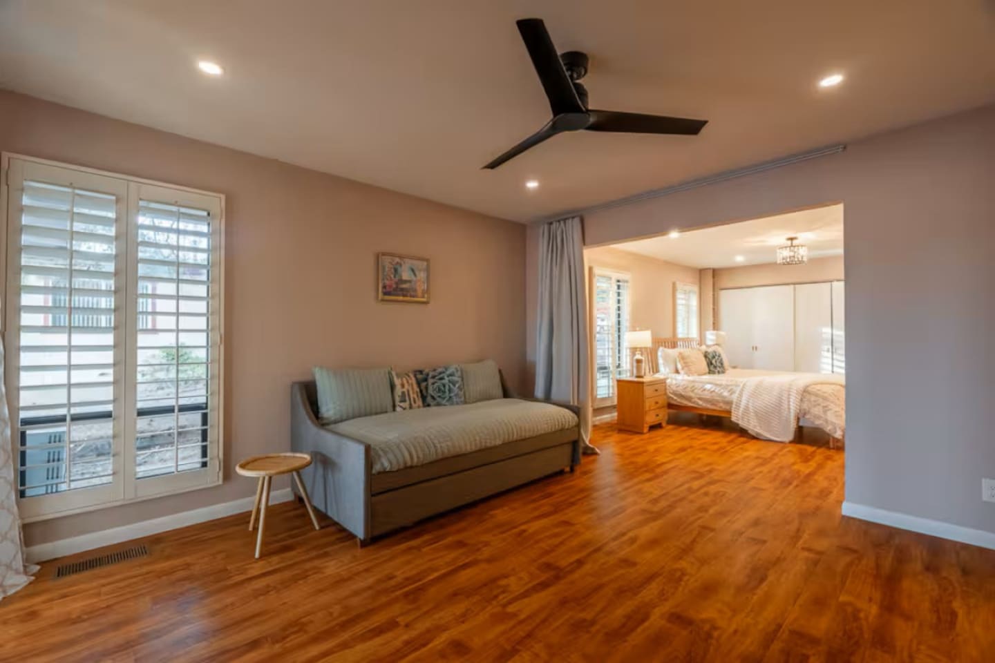 This spacious 2-bedroom, 2.5-bath home comfortably accommodates up to 6 guests. The primary suite features a king-size bed and an en-suite bath with a walk-in shower. There is an additional private space connected to the primary suite with a pull-out couch. The second bedroom includes a queen bed and access to a full bath. A half bath is available off the main living area. The open-concept kitchen, dining, and living spaces are perfect for gathering, and the large fenced backyard provides a peaceful spot to relax.