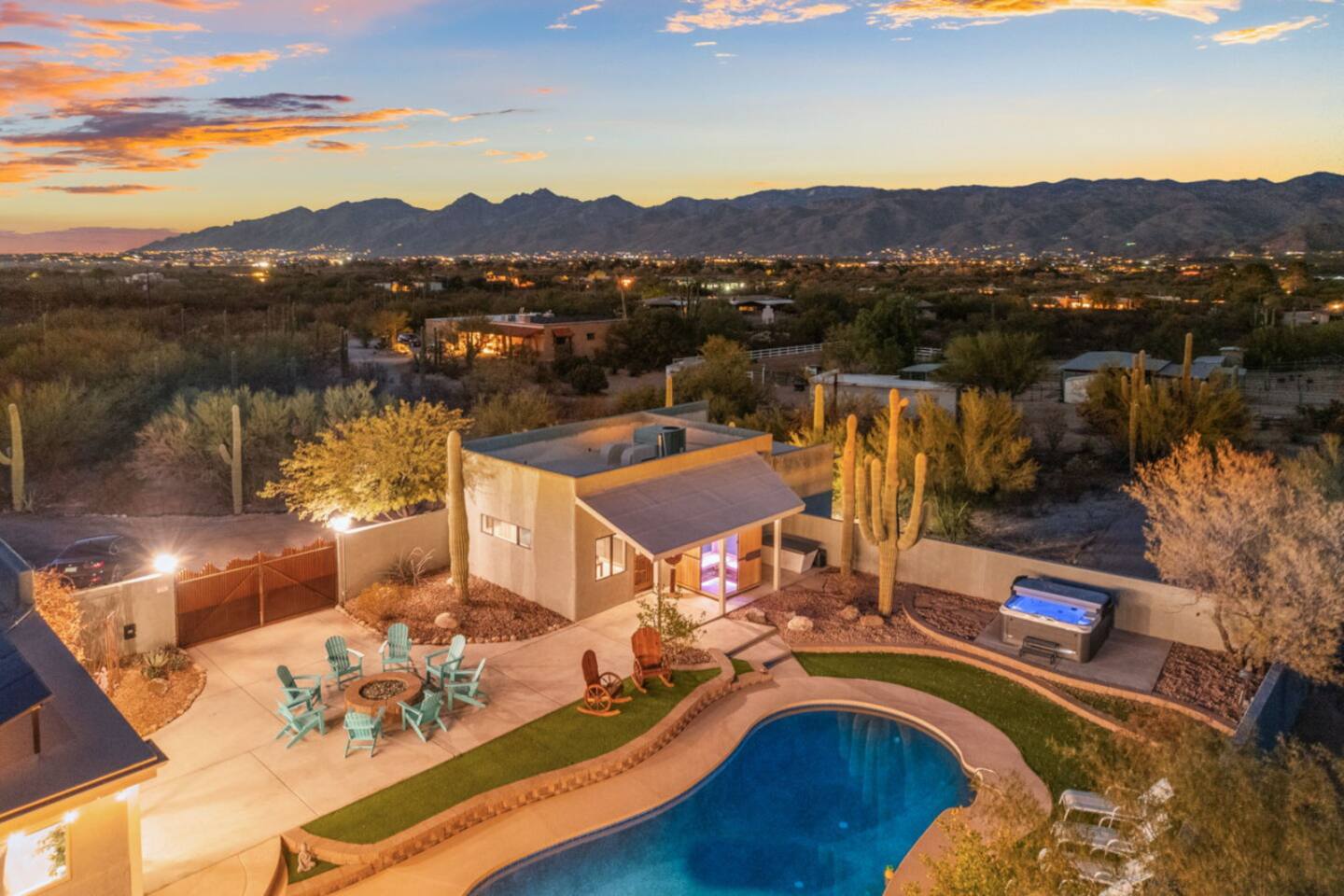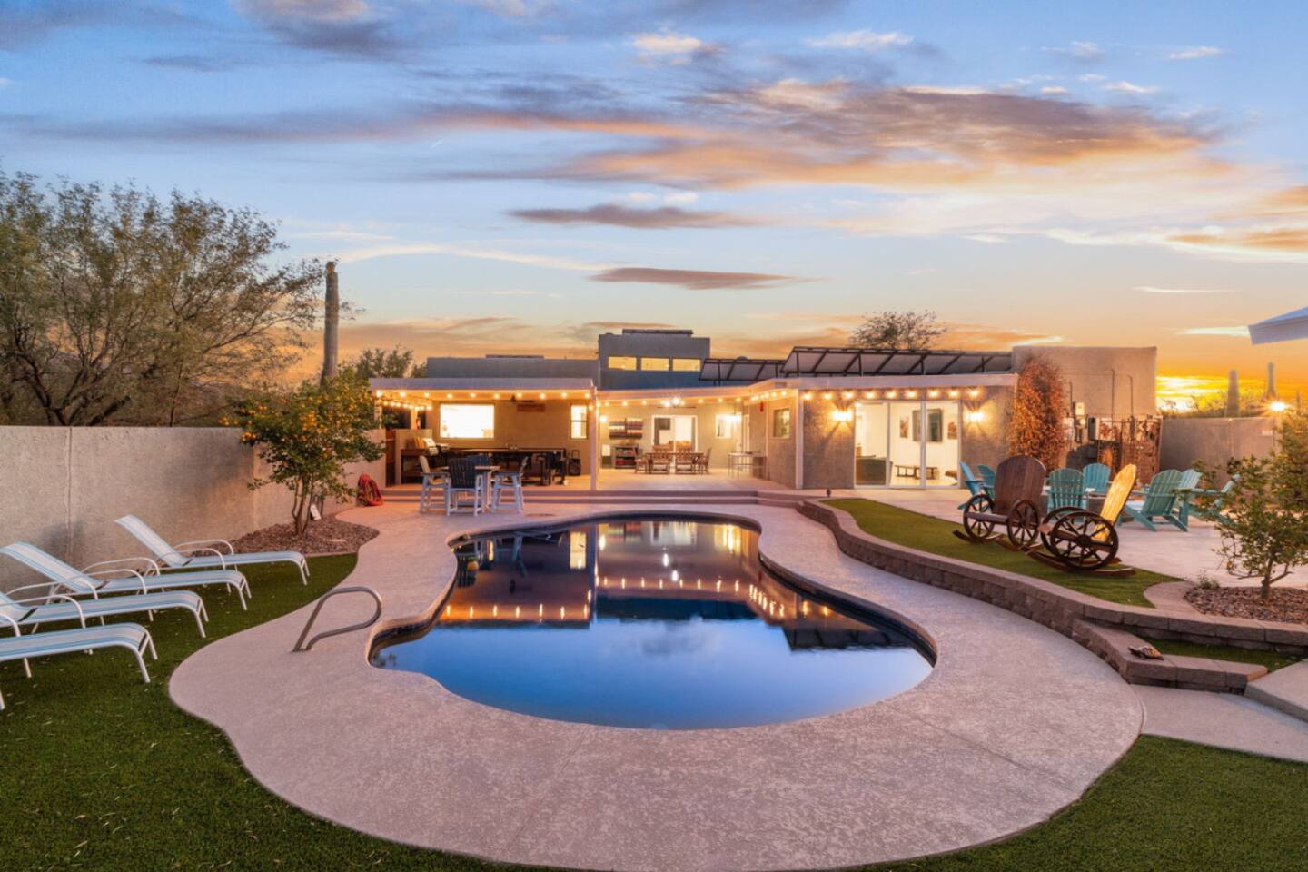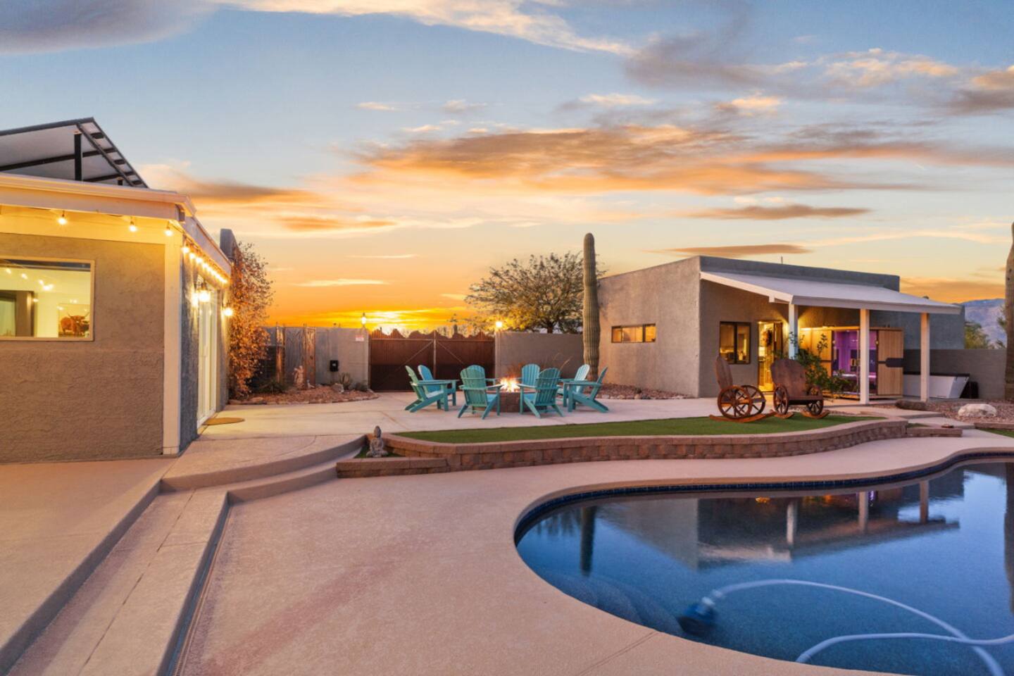 Our luxurious southwest charmer offers resort style living with all the modern amenities! Nestled in a peaceful country estate subdivision next to the Saguaro National Park, our newly remodeled home with casita spans multiple acres and has been strategically redesigned to accommodate large, multiple families and groups! Whether you are looking for a quiet sanctuary or an active adventure, we have what you need! Creating luxury vacation experiences is what we do best at Wagon Wheel Estates!